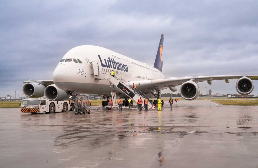 The world’s largest passenger aircraft made a spectacular landing on Ireland’s longest runway this as a Lufthansa Airbus A380-841 jet touched down at Shannon Airport.