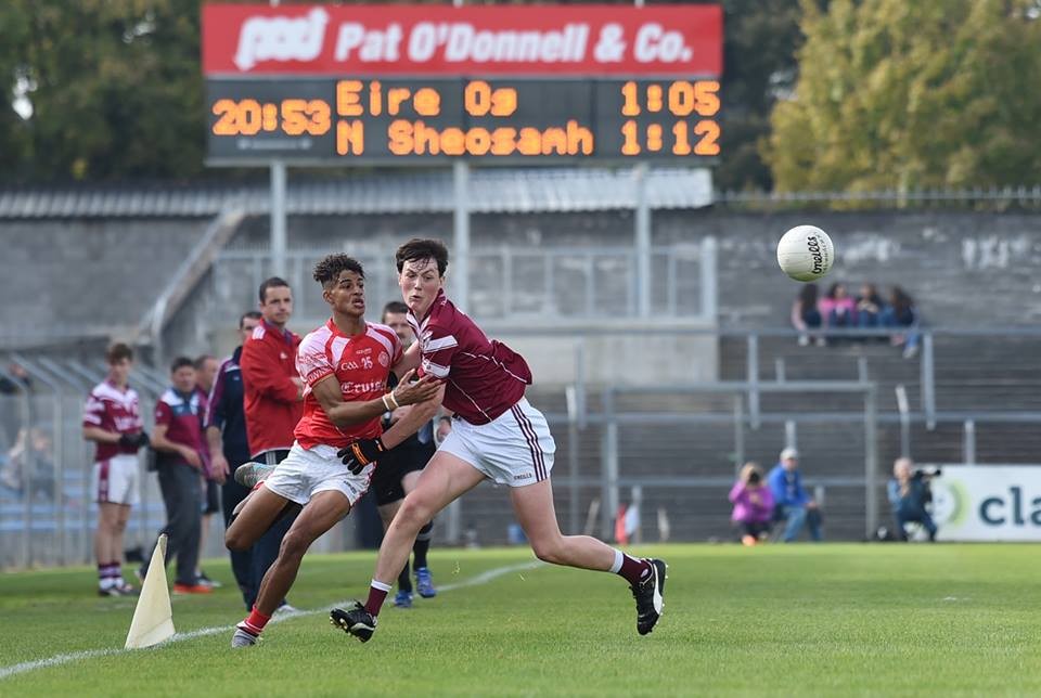 Éire Óg: Paddy Honan; Rory Brennan, Mark Collins, Cathal Darcy; Liam McMahon, Tadhg Connellan, Darren O’Brien (0-01); Ikem Ugwuru, Danny Griffin; Phillip Talty (0-02), Gavin Cooney, Colm Walsh O’Loughlin (1-00 Pen); Ben Quinn (0-03 2f), Barry Cotter, Colin Reidy. Subs: Jamie Roche for Reidy (37), Cillian O’Donoghue for Quinn (50), Paul Martin for Brennan (61), Colm McGrath for Darcy (61), Jack Connolly for Cotter (64).