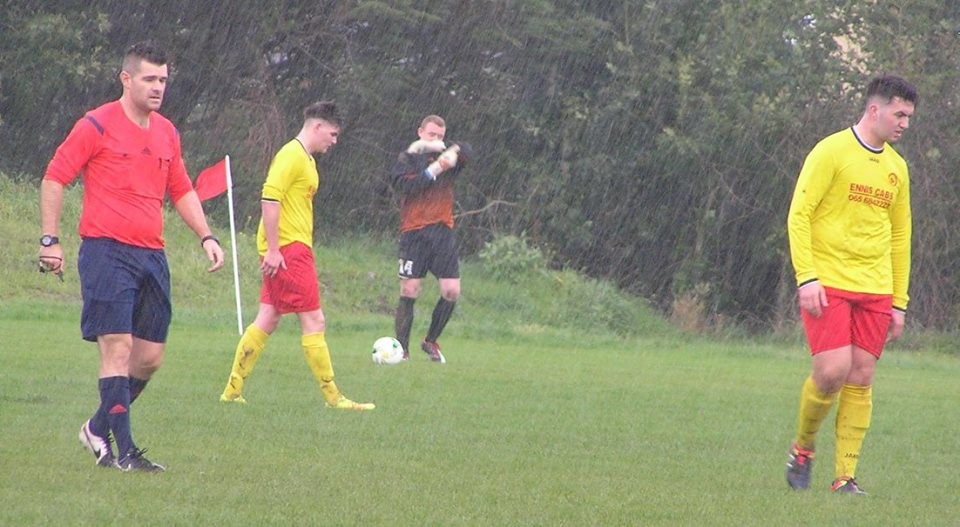 Conor O’Brien had a good strike for Ennis Town from the edge of the box that Barry Ryan did well to save in the wet conditions.