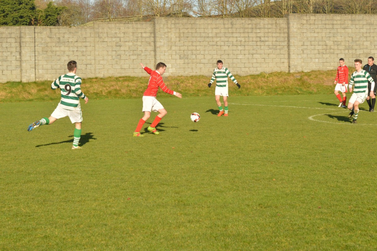 Moments later, McCormack was involved again, Collins’ low driven cross was turned past the on-rushing Joseph Gallagher to double Celtic’s lead. Dominating in possession, Newmarket grabbed a third, Michael Leigh’s missed cued clearance found the waiting David McCarthy twenty yards from the opposition goal and he expertly arrowed a low driven shot past the cluster of visiting defenders.