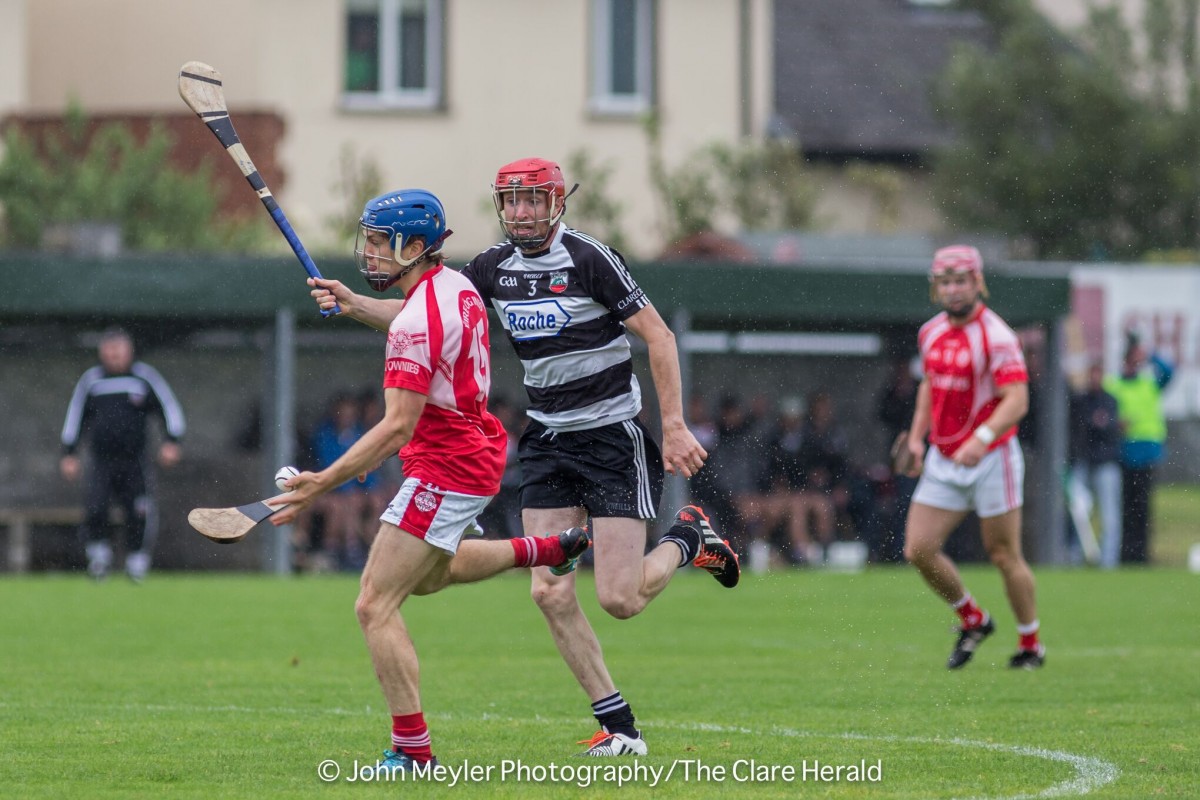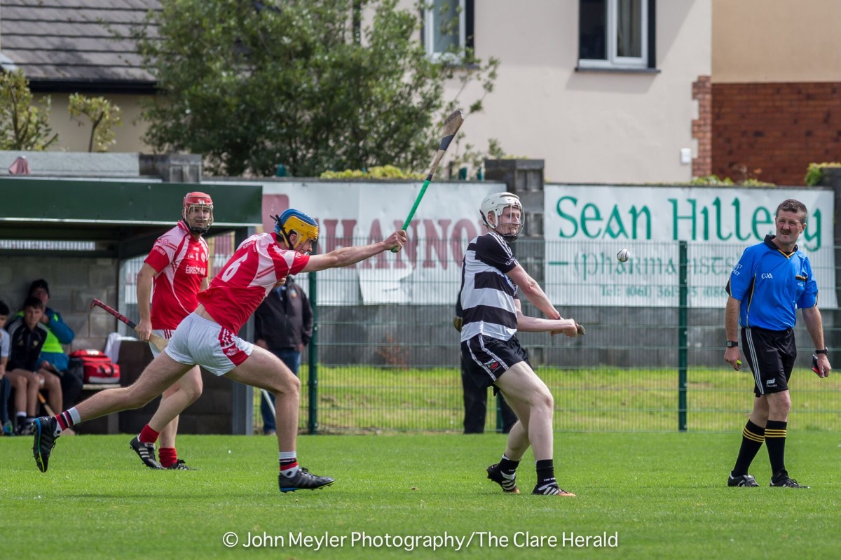 Clarecastle struck for goal two minutes later. Briain Lynch’s delivery was fielded by Derek Quinn who offloaded to the on-running Jack Murphy with the corner-forward firing low and hard past Kevin Brennan. Duggan slotted over a free to leave two points between the teams but the Townies responded with Barry Nugent and David Reidy points.