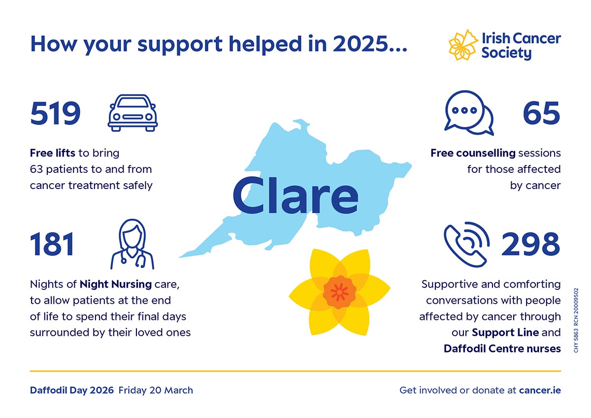 For more information the range of services and supports delivered by the Irish Cancer Society in Clare, see infographic attached.