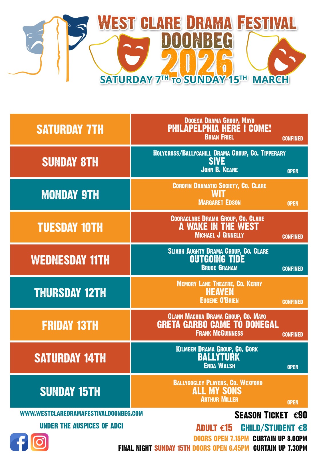 For a full line up of all the plays and their details, visit the website and follow West Clare Drama Festival on Facebook and Instagram.