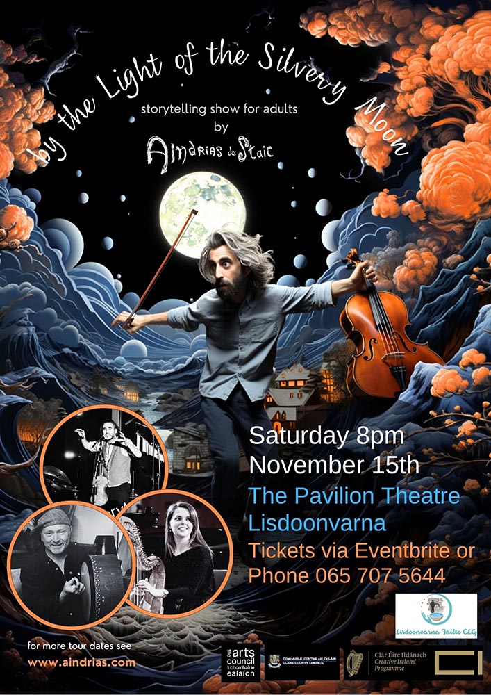 Clare’s beloved storytelling icon Aindrias de Staic is riding a wave of extraordinary success with his nationwide tour of By The Light of The Silvery Moon, now in its third sensational run.