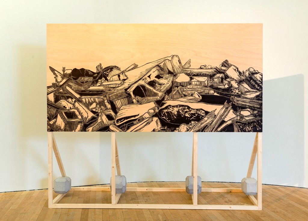 Geological Cake, constructs ersatz topographies, monuments, edifices and pseudo-geographies. In a fragmentary era where things, both tangible and technological, are fluid and in flux, the work attempts to document, reproduce and reference the Artist’s direct environs.