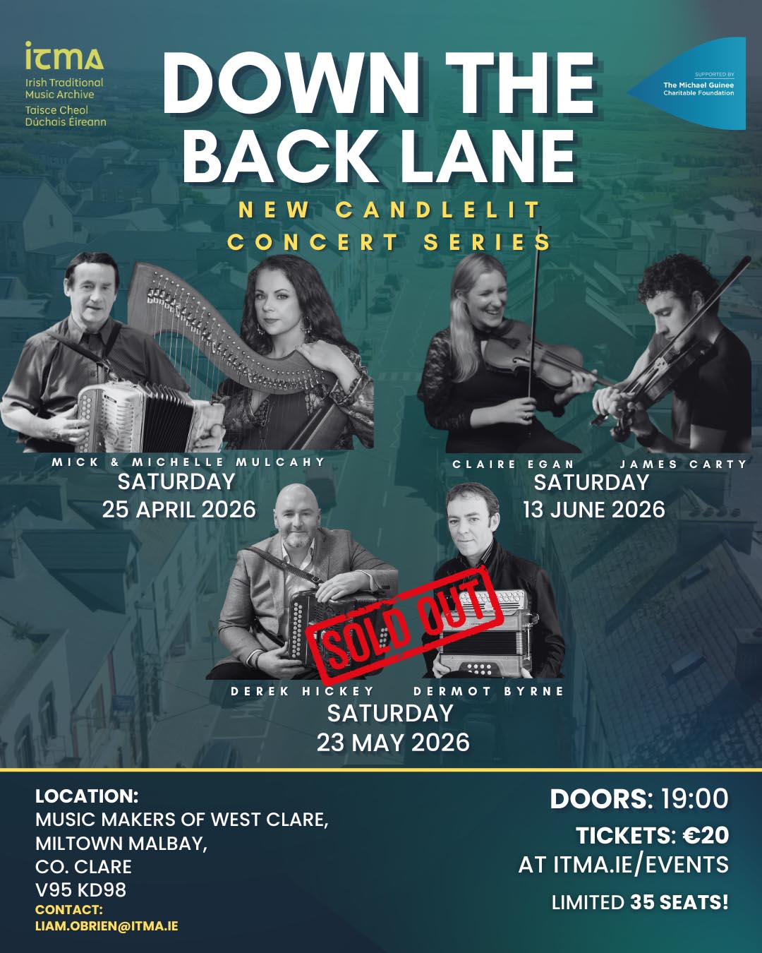 The Down the Back Lane series will present unique, candlelit listening experiences showcasing some of the finest artists in Irish traditional music. With just 35 seats available, these concerts offer a rare chance to hear masters of the tradition in an intimate setting. They will be hosted in ITMA’s Miltown Malbay satellite office in Oidreacht an Chláir.
