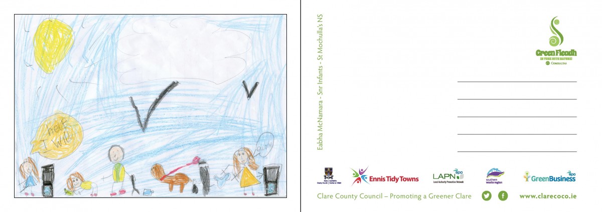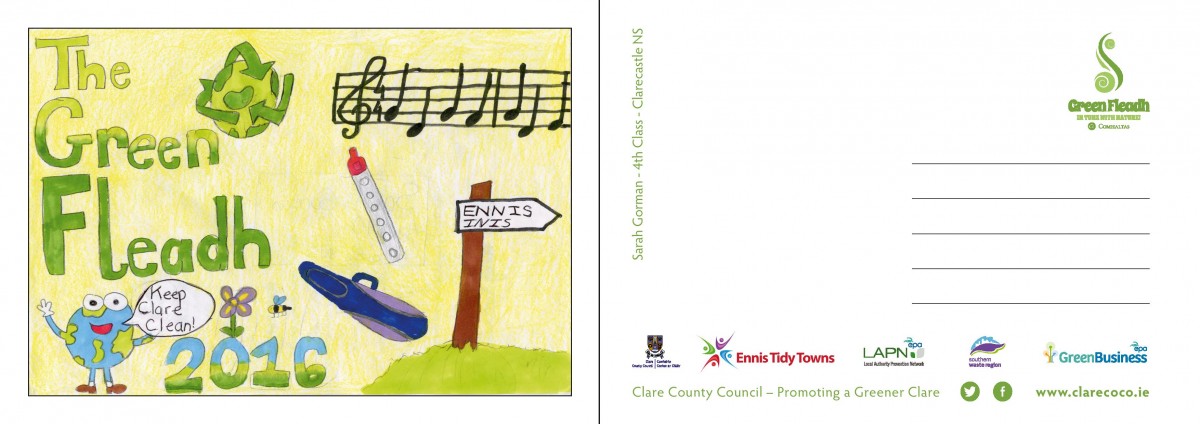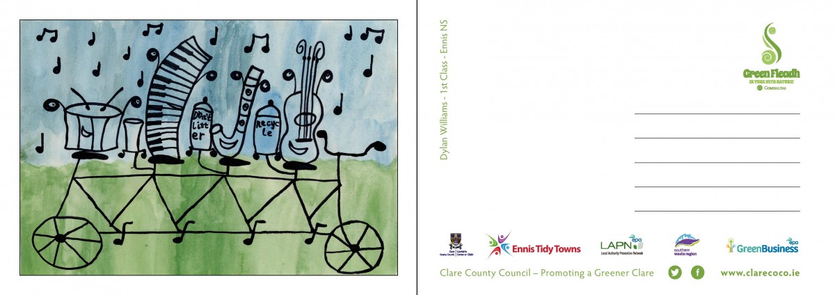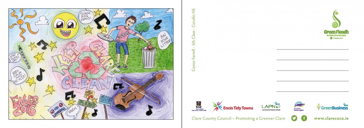 Postcards carrying important environmental messages and designed by young people from across County Clare have been distributed throughout Ennis to coincide with the start of Fleadh Cheoil na hÉireann 2016.