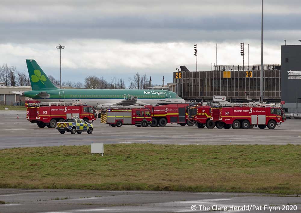 Units of Clare County Fire and Rescue Service from Shannon Town were sent to the airport while crews from Ennis station were mobilised to a designated holding point adjacent the M18 motorway in case they would be required.
