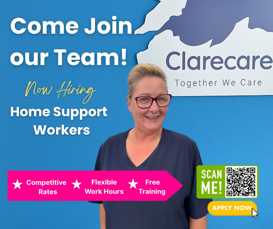 “If you’re compassionate, kind, reliable, and trustworthy — and want to make a real difference in people’s lives — we’d love to hear from you. Whether you’re just starting your career or looking for a meaningful change, now is the perfect time to join Clarecare’s growing and vital Home Support Service.”