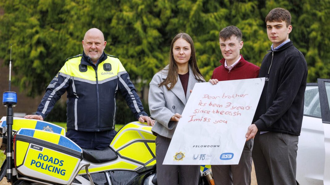 Produced by SETU students Harry Watkins, Patryk Pawlak, Stephen Sokiri, Andrei Bors, and Kasey Mulhearne, the poster was designed to resemble a crumpled piece of paper featuring a young child’s scrawling handwriting. Artfully conceived of as a letter to their deceased sibling, the words in red crayon read: ‘Dear brother, it’s been three years since the crash. I miss you.’
