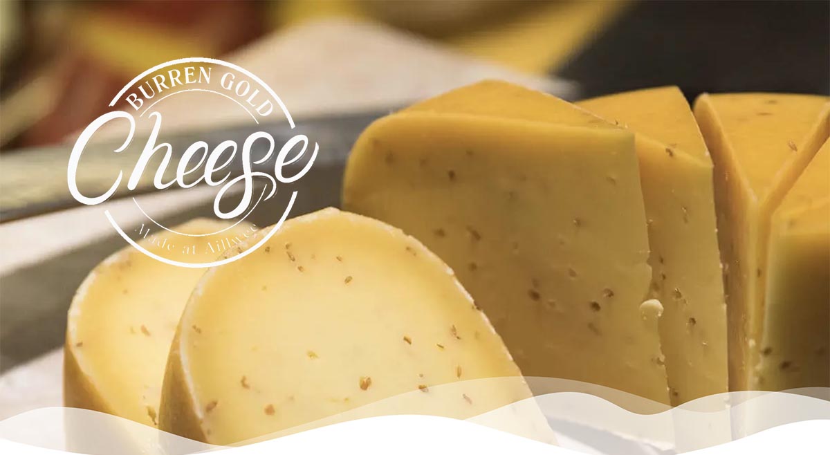 Another creative innovation on Aillwee Mountain came about in 1985 when The Burren Gold Cheese Making factory and Farmshop were developed on site. For over 40 years cow’s milk from the same dairy herd, grazing just 6km away at Caherconnell, have been used to annually produce 12 tonnes of traditional Farmhouse Cheese, Burren Gold Gouda.